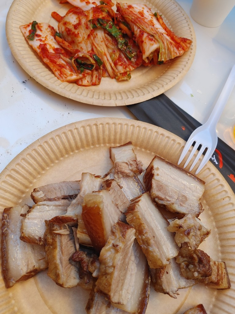 E proprio come per la preparazione della salsa con cui alla fine si preparava un piatto di pasta per provarla, anche con il Kimjang ho avuto l’onore di assaggiare il kimchi appena fatto accompagnato dal 보쌈 (Bossam, un bollito di maiale con cui il kimchi si sposa particolarmente bene) coccolata da una gentilissima 어머니, la mamma di Giulia ( amica, collega e fondatrice di lacoreaa360, preziosa fonte per gli appassionati https://lacoreaa360.com/kimjang-kimchi-cultura-coreana/ ) che sistemava il Kimchi su ogni pezzo di bossam raccontandomi aneddoti sulla preparazione e sulla tradizione della loro famiglia.