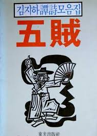 Nel 1970, un anno dopo il suo debutto pubblica la prima bomba, La raccolta “la terra gialla” che è poi quella tradotta in italiano con il titolo “ la strada di polvere gialla” e con questa l’opera che non solo presenta la sua essenza, ma che segnerà profondamente la sua vita e quella dei suoi lettori, ovvero “I Cinque Banditi”. Un poema che racchiude il dolore e la rabbia accumulati in carcere e che esprime in una ferocissima satira contro il governo e contro tutte le figure corrotte che vi orbitano attorno. Nella narrazione, sul fronte opposto un contadino che abbandona la campagna per cercare di sopravvivere alla fame e alla disperazione, ma viene condannato in quanto bandito. Ma chi sono in realtà i banditi? Scrive Kim:” Cinque banditi vivono vicini al cuore di Seoul , insuperabili in scaltrezza e furberia: il ministro, il deputato, il capitalista, il funzionario e il generale. Al contrario ai comuni mortali che hanno cinque organi interni e sei budella, loro hanno sette budella e un sacco da ladri grandi come i testicoli di un enorme toro. Hanno imparato tutti a rubare dallo stesso maestro e sono ormai abili come prestigiatori”.